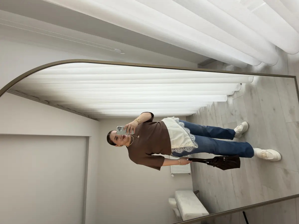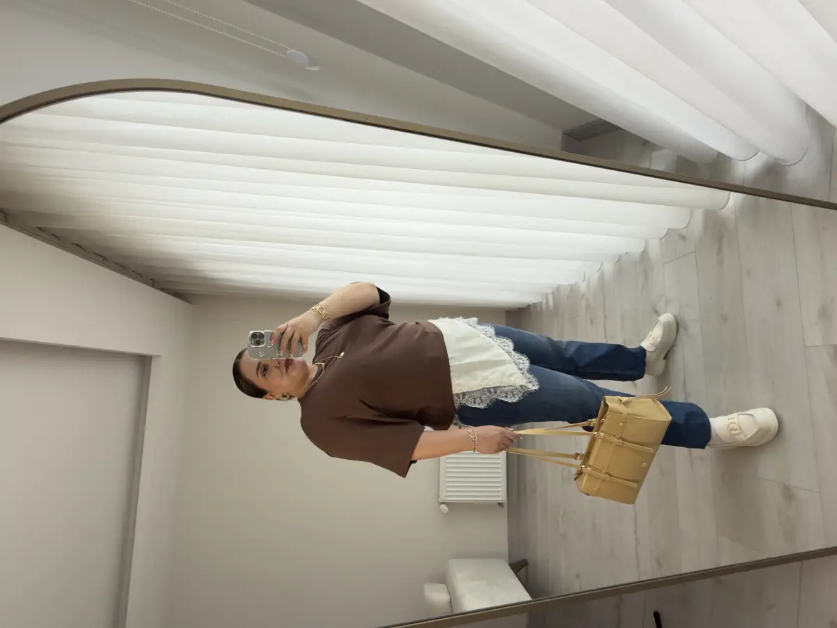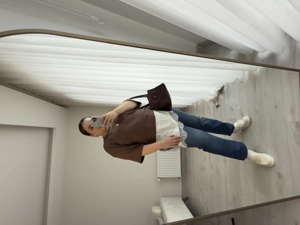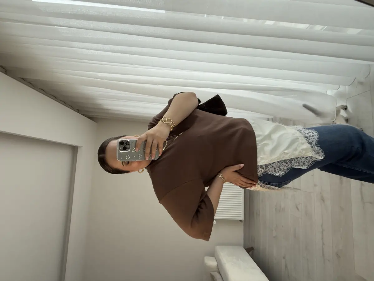 ALTI EKRU SATEN KUMAŞ ÜZERİ DANTEL ÜSTÜ KAHVE TRİKO BLUZ