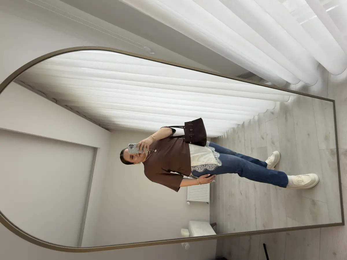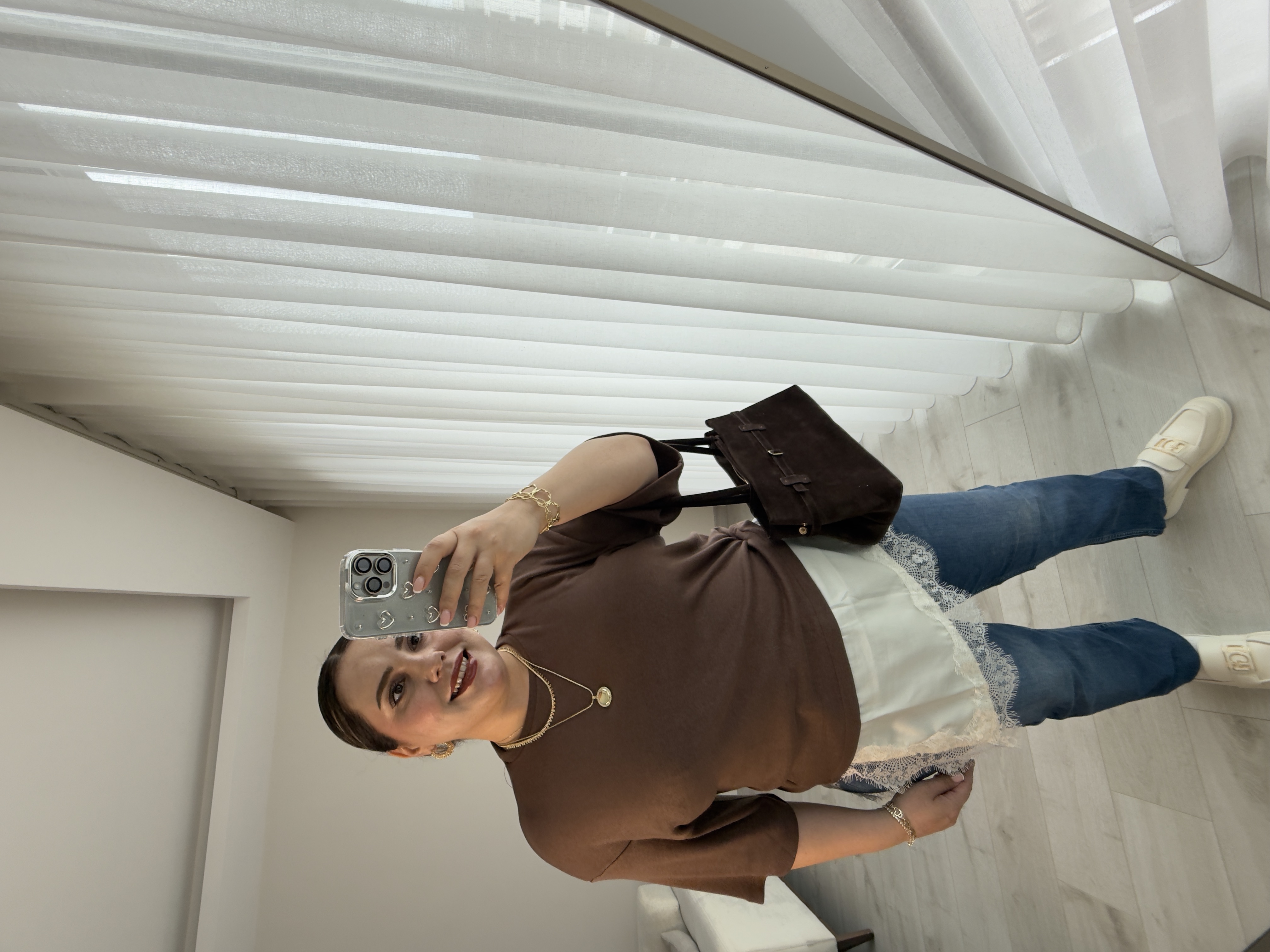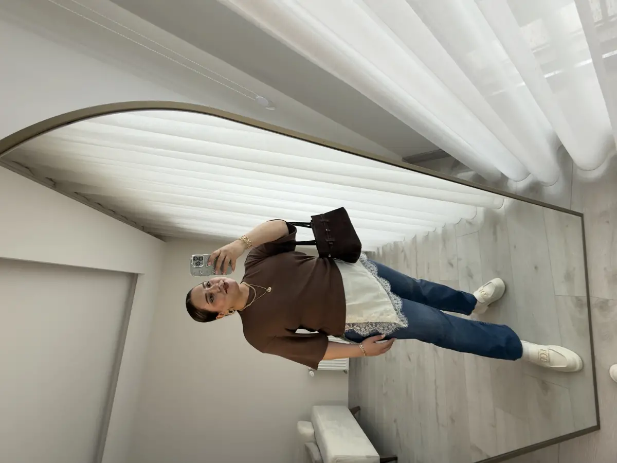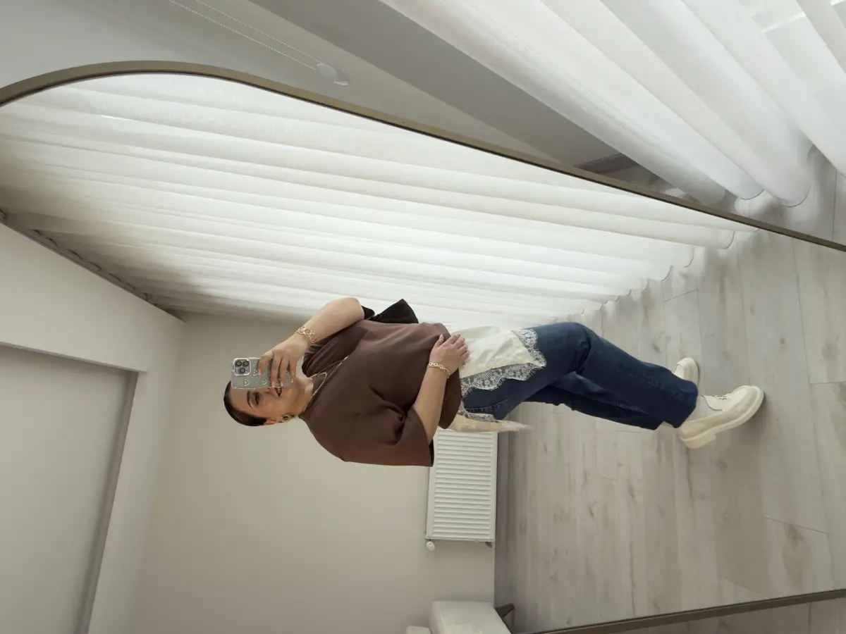 ALTI EKRU SATEN KUMAŞ ÜZERİ DANTEL ÜSTÜ KAHVE TRİKO BLUZ