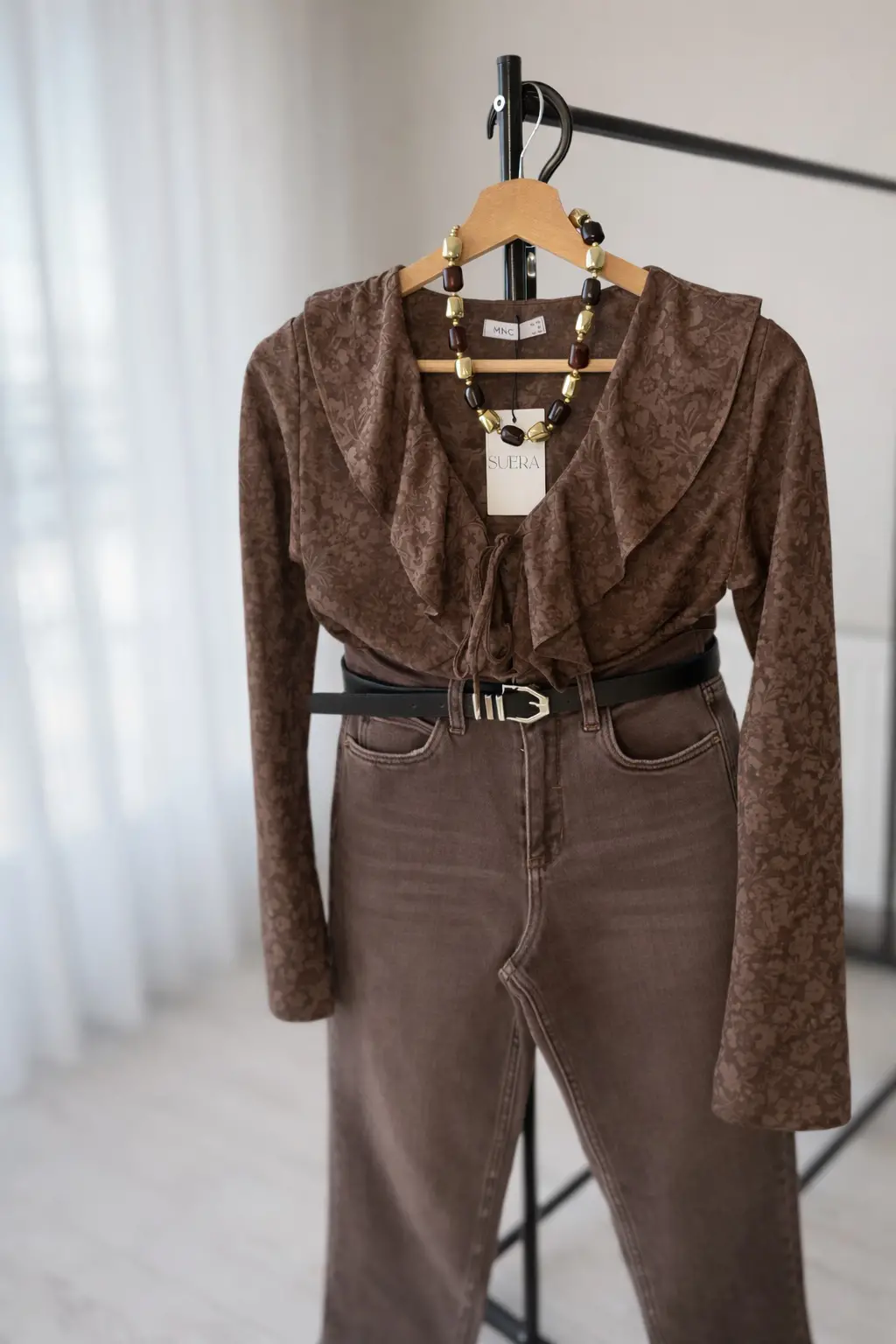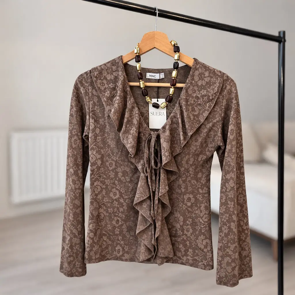 KAHVE KOLLARI İSPANYOL DETAYLI ÖNÜ BAĞLAMALI TRANSPARAN BLUZ