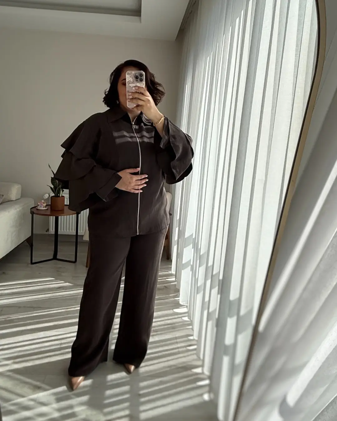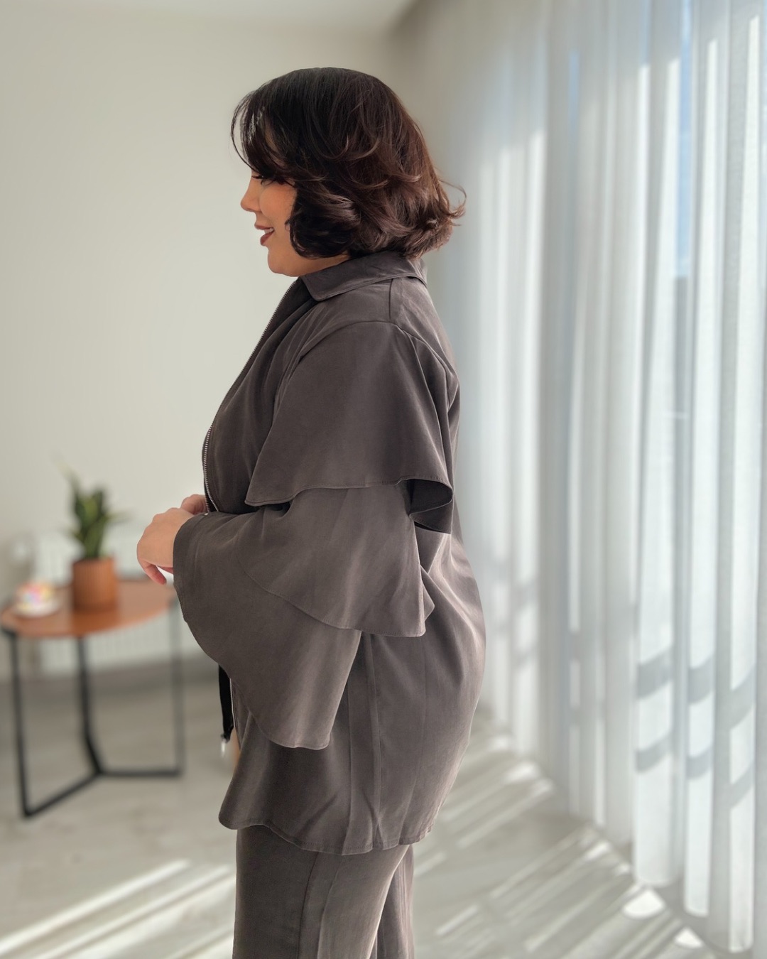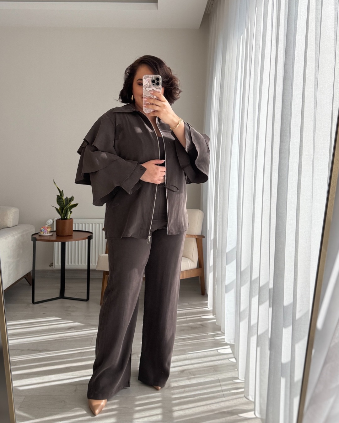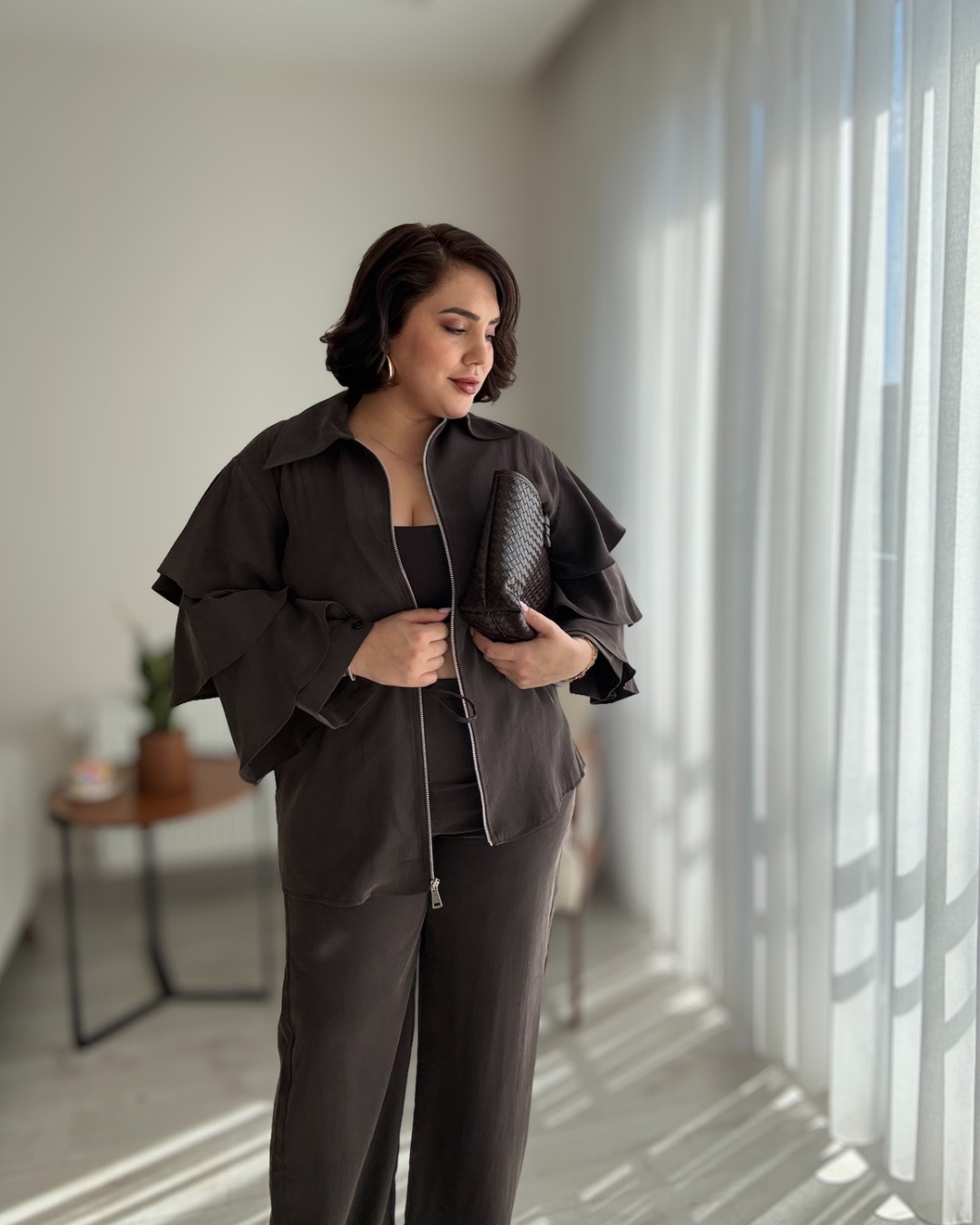 KOLLARI VOLANLI BLUZ VE BELİ LASTİKLİ PANTOLON
