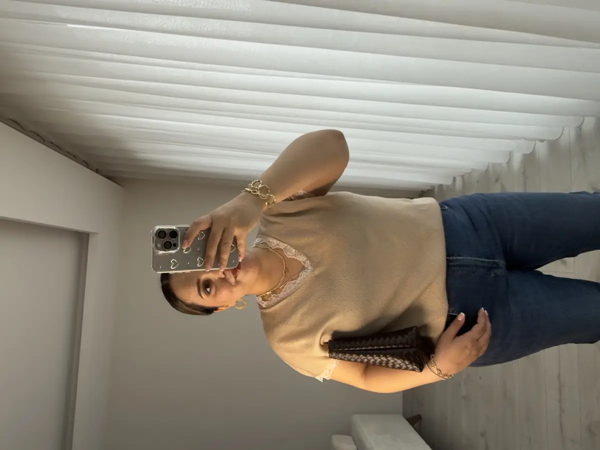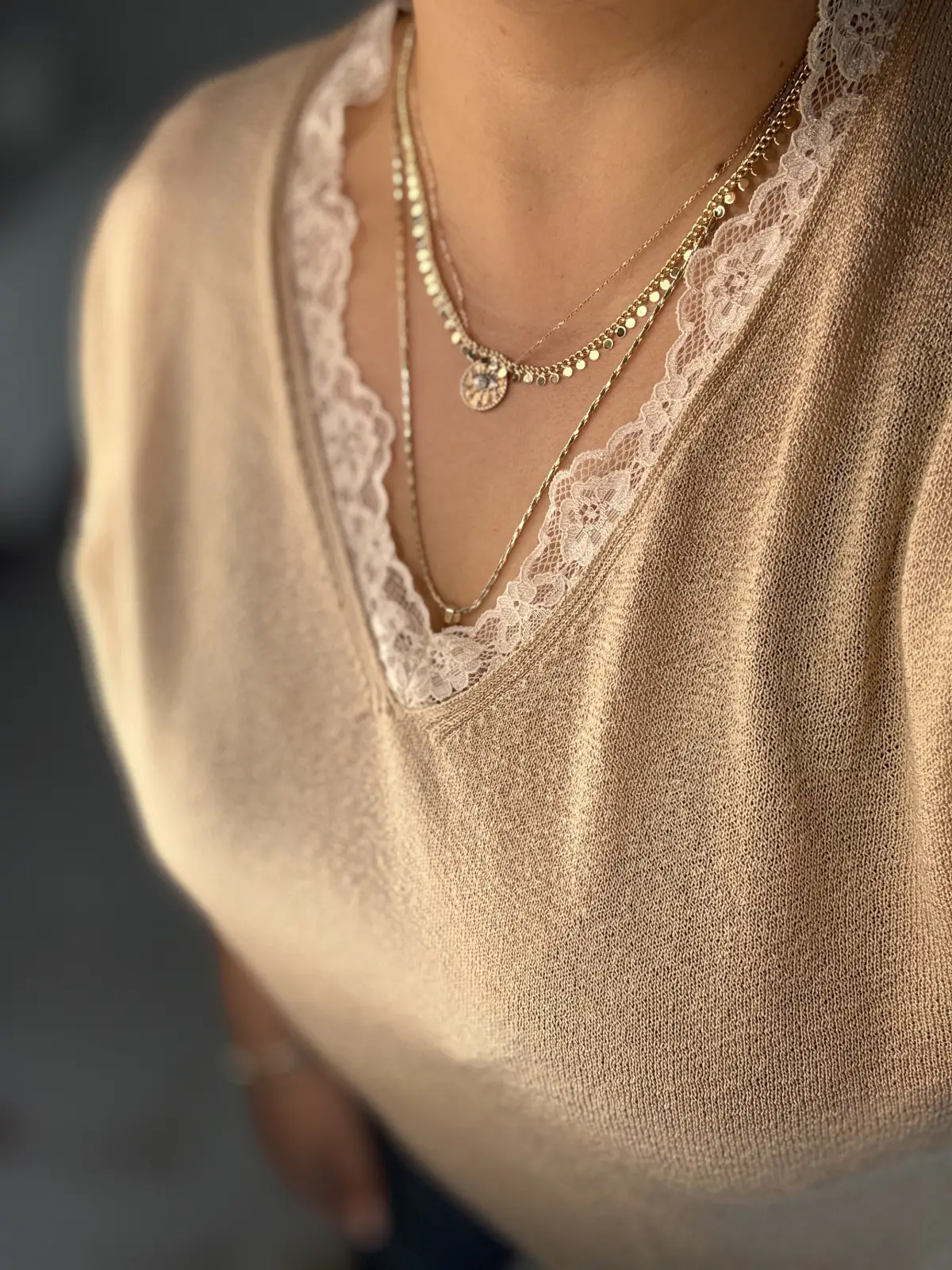 YAKA VE KOLLARI DANTEL DETAYLI KUM RENGİ TRİKO